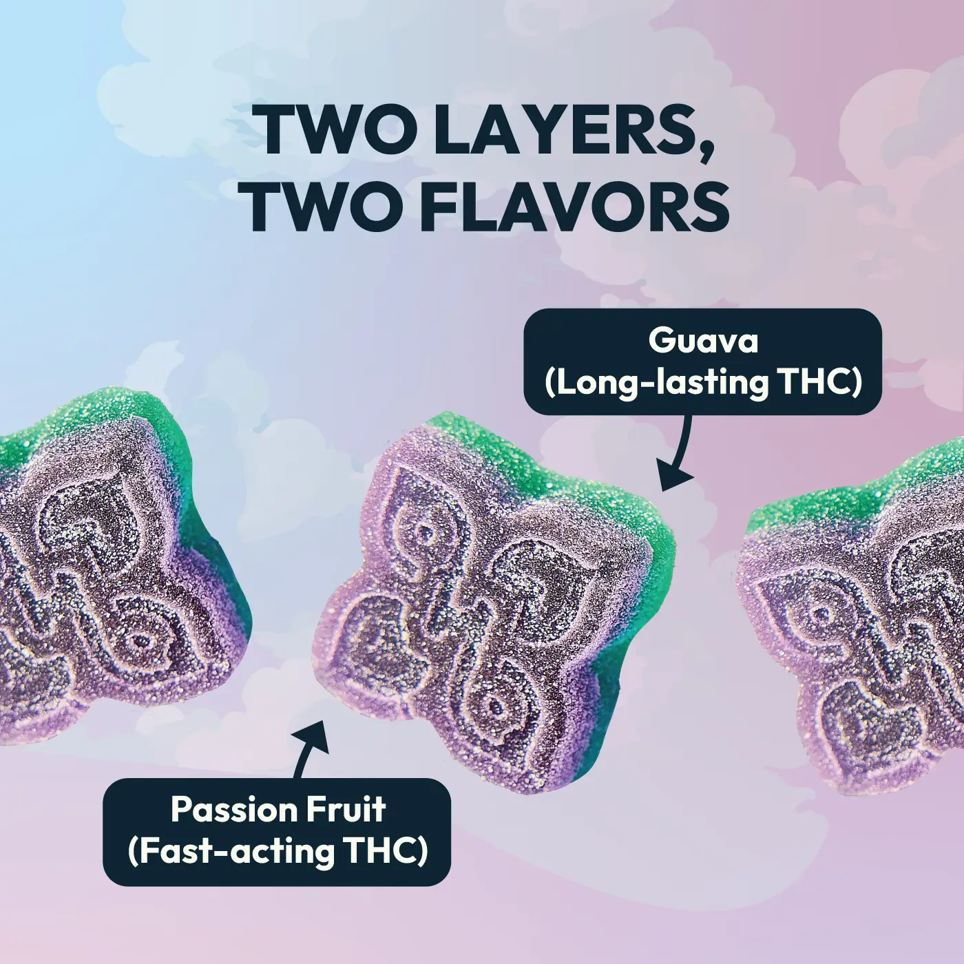 What are Double Take Gummies? They’re the perfect blend of innovation and tradition. Fast-acting Delta-9 THC delivers effects as soon as ~15 minutes, followed by a second phase of classic Delta-9, which delivers higher potency for a longer duration. Simply put, these gummies get the good times going sooner and keep them going.